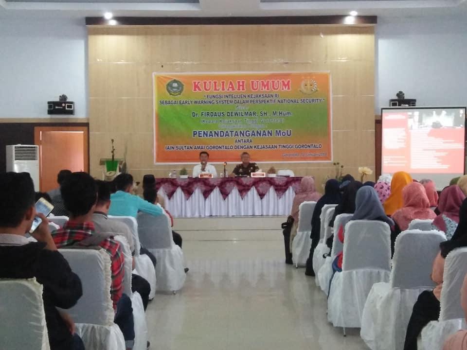 JINAYAH – Kamis, (10/01/19), Institut Agama Islam Negeri Sultan Amai Gorontalo menyelenggarakan Kuliah Umum yang mengangkat tema tentang Fungsi Intelijen Kejaksaan RI sebagai Early Warning System dalam Perspektif National Security.