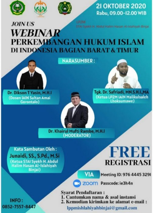 JINAYAH – Dosen Jurusan Hukum Pidana Islam, Dr. Dikson T Yasin, S.HI, M.HI menjadi pemateri dalam kegiatan Webinar yang dilaksanakan oleh Lembaga Penelitian dan Pengabdian Masyarakat Sekolah Tinggi Agama Islam Syeikh H. Abdul Halim Hasan Al-Islahiyah Binjai. Kegiatan tersebut dilaksanakan pada hari Rabu, 21 Oktober 2020 jam 09.00-12.00 WIB melalui via Zoom.